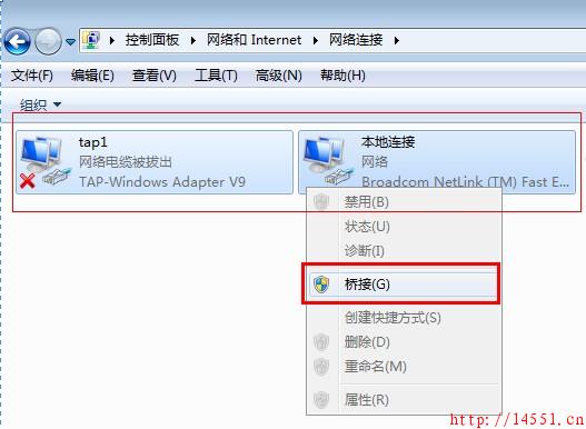 2、网络方式有2种,根据电脑天空自己测试,如果你是本机激活的话,直接用“网127.0.0.2:1688”的方式启动软件就可以激活了,也可以安装TAP网络接口,用“通过TAP网络接口”的方式来激活 如果你需要激活局域网(包括虚拟机)或者互联网上的系统或者office,则必须用使用TAP网络接口,并且桥接正在使用的网卡(本地连接或者无线网络),具体方法是同时选中网卡和tap1网卡,然后右键选择“桥接”就可以了。(注意:安装TAP之后,需要在适配器设置里把TAP网卡的重命名位tap1,否则无法使用。)