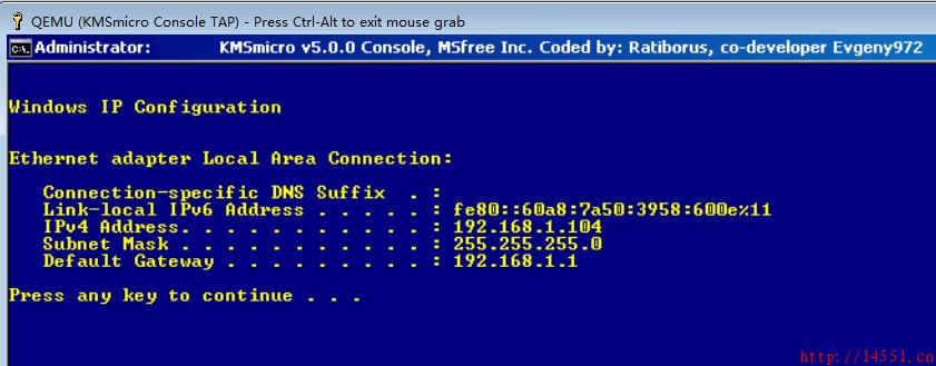 5、如果你要局域网或者互联网激活的话,可以用HEU KMS Activator来激活,把地址写成你虚拟机的ip即可,在虚拟机里按“i”键就可以知道ip了,前提是你要做前面所说的桥接。互联网激活的话需要把ip和端口映射出去,告诉你的朋友,他就可以通过你的虚拟机来激活了,嘿嘿,可以在朋友面前做一次高手啊