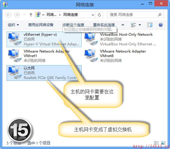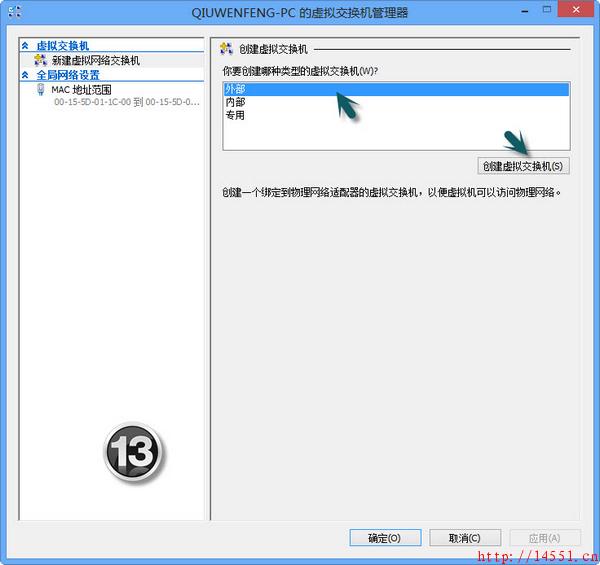 我们需要在Hyper-V管理器中创建一个虚拟交换机。单击右侧的“虚拟交换机管理器”链接打开“虚拟交换机管理器”窗口(如图12);这时,只需选择“外部”虚拟交换机(内部网络只用于虚拟机和物理计算机之间的连接;专用只能由物理计算机上运行的虚拟机使用),单击“创建虚拟交换机”按钮(如图13);接着,需要输入交换机的名称(Hyper-V),应用即可(如14),这时将导致网络挂起一会。然后,我们进入“控制面板→网络 Internet→网络连接”会发现原来的网卡变成了以太网即虚拟交换机了,还新增加了一个网vEthernet(hyper-v),这就是主机新的网卡了,需要进IP地址设置才能上网了(如图15,如果路由器设置为自动获ip地址则无需这个操作);接着,我们对新的网卡进行IP地址DNS设置(如16),完成后,主机连接到了Interner;Hyper-V的虚拟机仍然需要设置网络适配器才能联网,我们进入虚拟机的“设置”窗口,选择左侧的“网络适配器”,将右侧的虚拟交换机设置为hyper-v”(即刚才建立的虚拟交换机名字,如图17);现在我们运行虚拟机也可以轻松上网了(如图18)