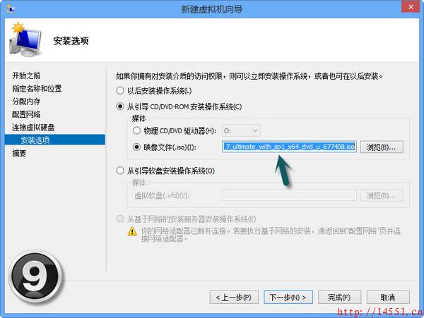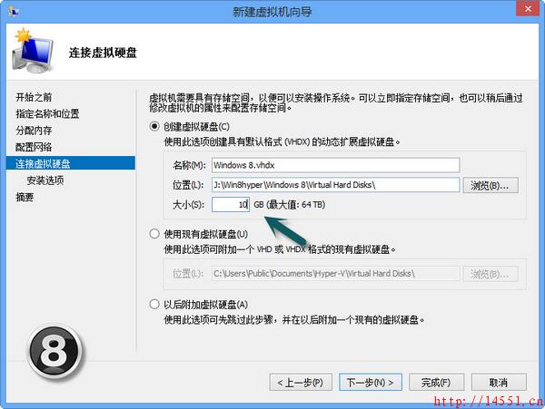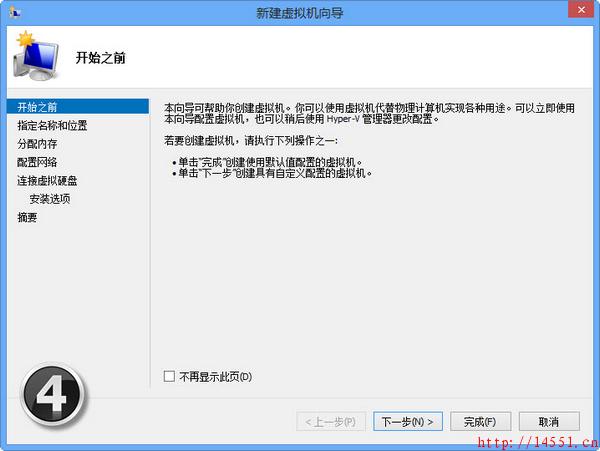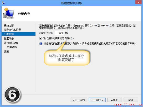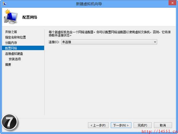 下面我们就可以来通过Hyper-V创建一个虚拟机了。我们可以打开“控制面板→系统和安全→管理工具”双击Hyper-V 管理器”图标。这时,打开的Hyper-V管理器”窗口还没有虚拟机。我们可以单击“操作→新建→虚拟机”命令即可弹出“新建虚拟机向导”窗口(如图4);进入下一步的窗口需要设置虚拟机的名称,勾选“将虚拟机存储在其他位置”选项即可设置虚拟机存储的位置(如图5);这时可以设置启动内存,如2048MB(根据物理内存大小设置),可以勾选“为此虚拟机使用动态内存”提高虚拟机运行占用内存资源的灵活性(如图6);下一步将配置网络,还无法选择网络连接(如7),这是因为还未新建虚拟交换机;然后,我们可以连接虚拟硬盘了,这里选择“创建虚拟硬盘”,设置10GB,最大值是64TB,新VHDX虚拟硬盘文件格式可以支持的容量真够大的(如图8);接下来,我们可以设置安装选项以让操作系统在虚拟机安家,只需勾选“从引导CD/DVD-ROM安装操作系统”选项,选择系统映像ISO文件,单击“完成”按钮即可完成虚拟机的配置(如图9)