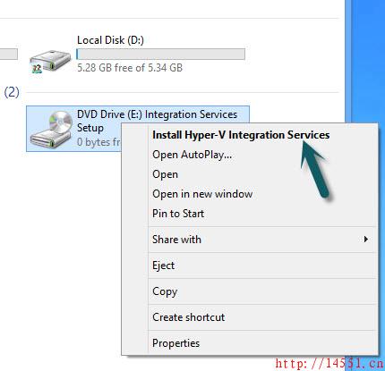 VMware Tools是一个很出色虚拟机插件,安装后可以让VMware虚拟机的显示、鼠标、时间同步、剪贴板共享等功能变得很合用,那么,Hyper-V是否也有类似功能呢?其实Hyper-V的集成服务就可以达到一样的效果。我们只需单击“操作→插入集成服务安装盘”命令,然后,在资源管理器中安装集成服务就可以了(如20)