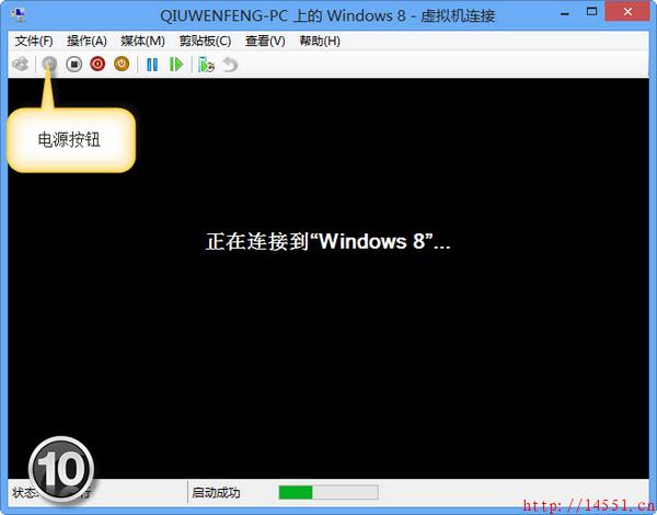 这时,我们需要回Hyper-V管理器窗口开启虚拟机来安装操作系统了。双击虚拟机列表的虚拟机名称即可打开窗口,接着,单击工具栏的“电源”按钮即可开启虚拟机了(如图10)。虚拟机安装系统和物理电脑完全一样,不再赘述了