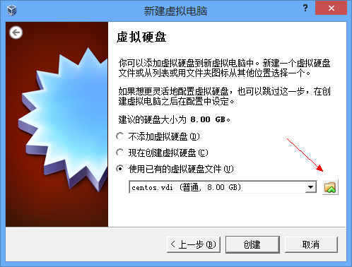 选择之前的那个vdi文件,其实就是虚拟硬盘.然后点击创建.