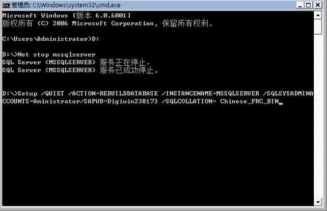服务停止后,输入命令Setup /QUIET /ACTION=REBUILDDATABASE /INSTANCENAME=InstanceName /SQLSYSADMINACCOUNTS=administrator /SAPWD= XXXXXXXX /SQLCOLLATION=Chinese_PRC_BIN即可