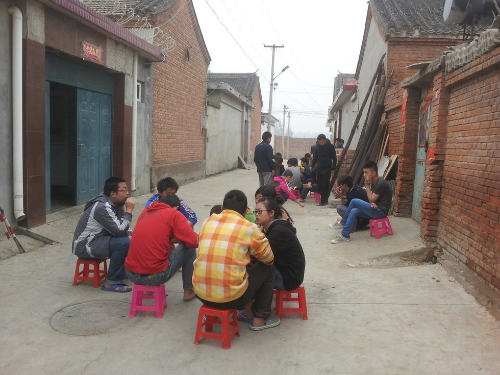 早饭过后群众演员在院外坐着聊天