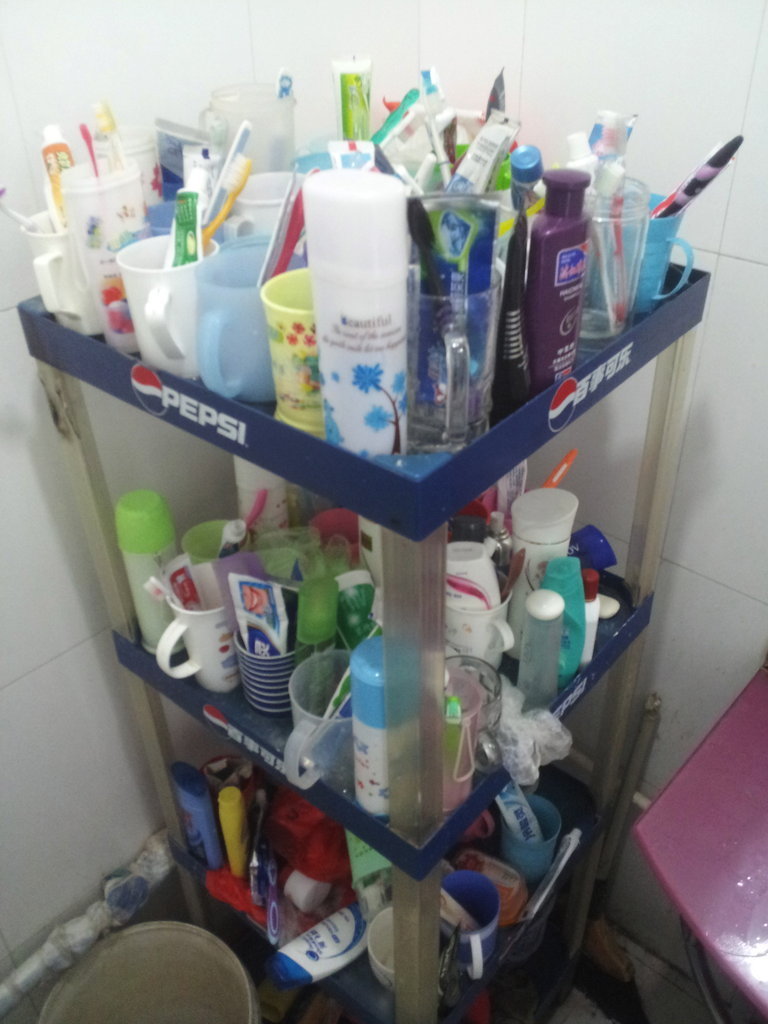 2平米不到的洗手间里,堆放着群众演员洗漱的用品