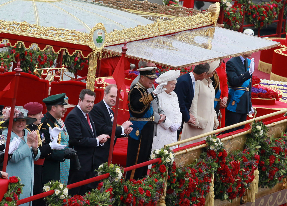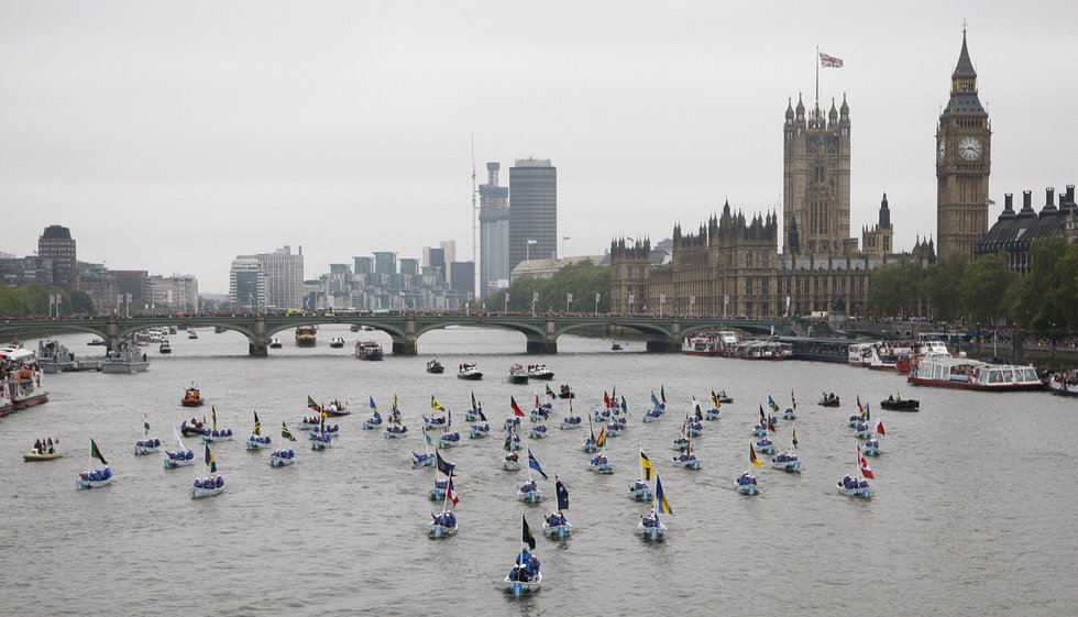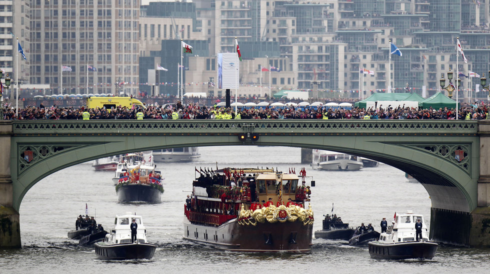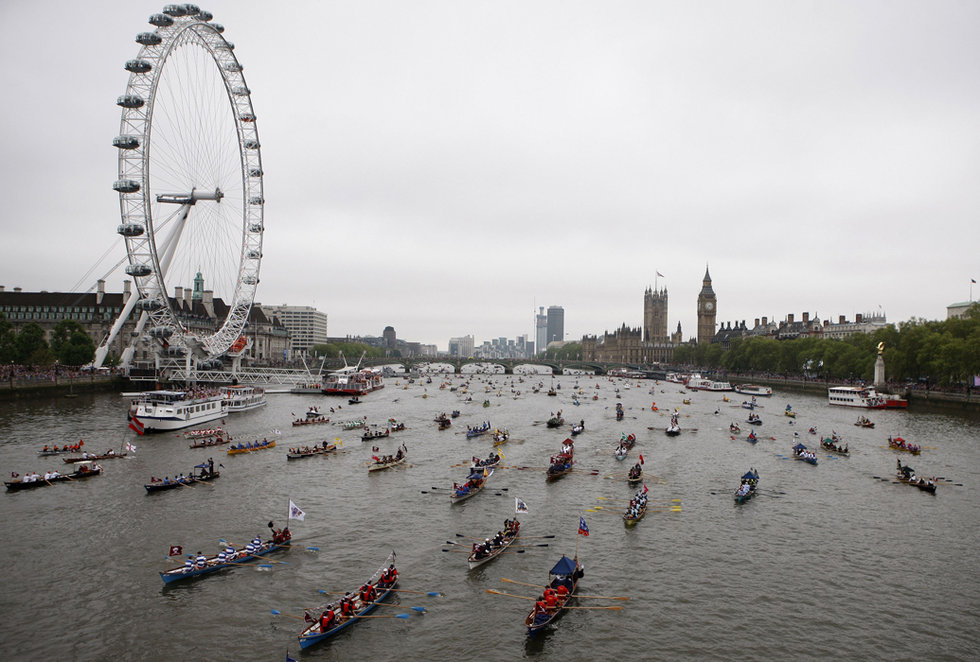 63日,船只从伦敦眼和大本钟前的泰晤士河经过。当日,多名英国皇室成员和女王伊丽莎白二世一起搭乘“王室之舟”(亦称“查特韦尔精神号”),率领千艘船只沿泰晤士河航行,以庆祝女王登基60周年。陪同女王搭乘“王室之舟”的包括威廉王子和凯特王妃、哈里王子、菲利普亲王和查尔斯王储等。整个船队由超过1000艘船只组成,全长超过7英里。庆典游行从伦敦西南方的巴特西桥开始,穿过泰晤士河上的14座桥,到达伦敦塔桥,全程25英里。英国定62日起连续放假4天并举行多项活动,庆祝女王伊丽莎白二世即60周年。新华社记 王丽