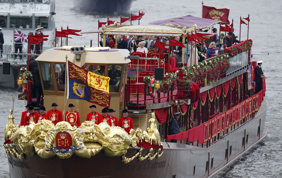 63日,英国女王伊丽莎白二世(船顶层、中)与皇室其他成员在“王室之舟”上。新华社记 王丽