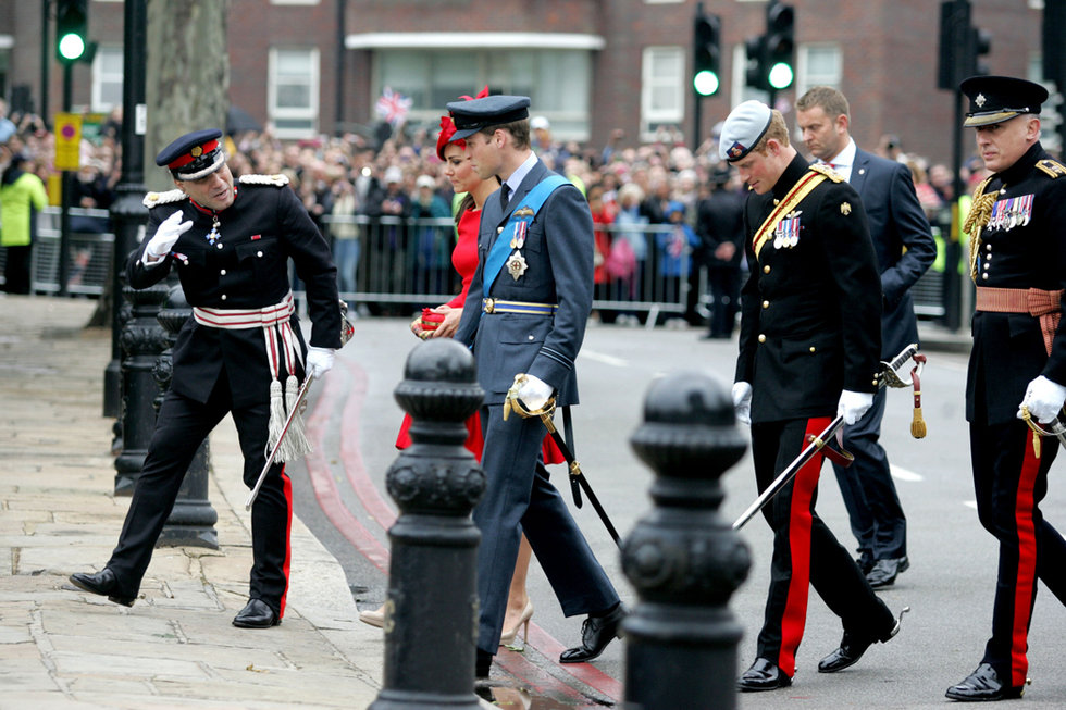 63日,在英国伦敦,威廉王子、凯特王妃和哈里王子准备登上“王室之舟”。新华社发(高塔姆摄