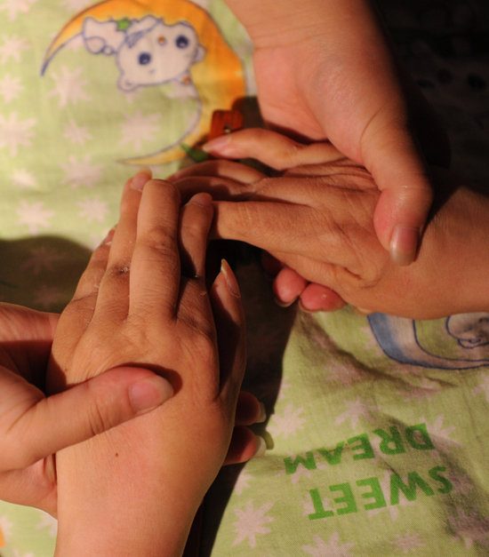 王璐给母亲按摩残疾的双手73日摄)