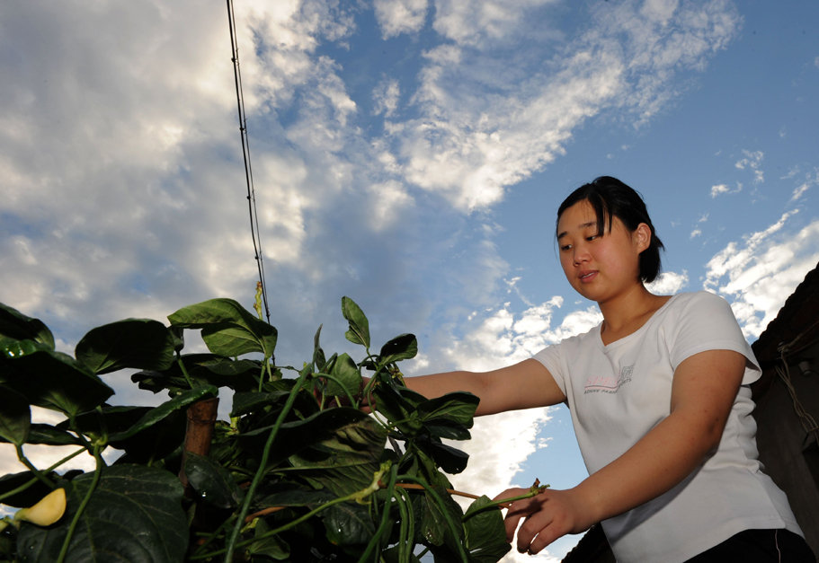 王璐在门前的菜地里打理蔬菜(73日摄)