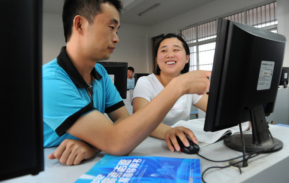 王璐在班主任老师强恒玉(左)的指导下在学校填写高考志愿(73日摄)