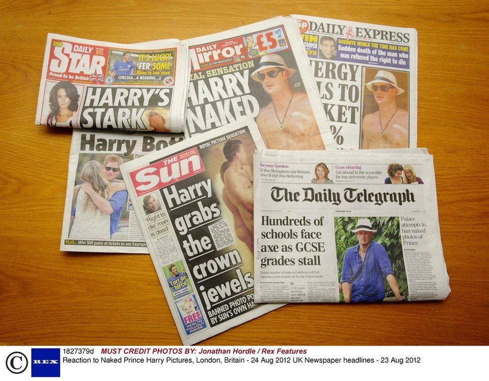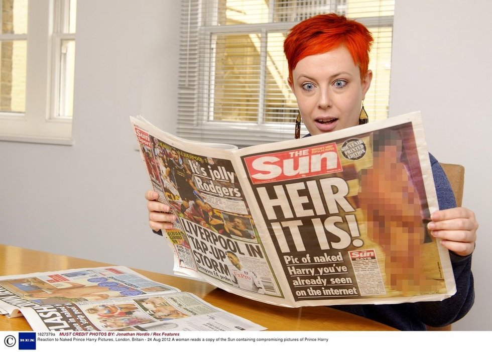 当地时间2012824日报道,英国《太阳报》无视英国王室禁令,824日的报纸头版刊登哈里王子裸照,《太阳报》在声明中称,读者有权看到它们。此前,英国王室曾与媒体投诉委员会联系,要求禁止英国媒体传播哈里王子裸照,而《太阳报》在823日的报纸上以自己报社同名记者哈里当“裸替”,情景再现了哈里王子赌城度假时,赤身裸体手捂下体扭脸躲避镜头的照片,并取标题为《哈里抓取王冠上的宝石》,封面下侧小字注明该“哈里”为《太阳报》同名记者。但时隔一天,《太阳报》无视王室警告,在报纸头版刊登了哈里王子的裸照