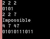 or the input is not valid, please output “Impossible. For example, if we have two 0’s and two 1’s,