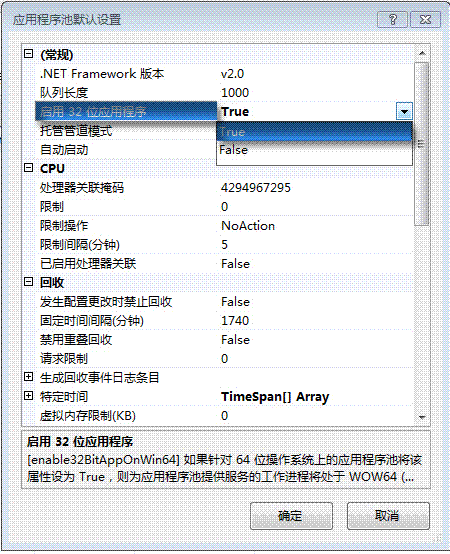 打开IIS信息服务应用程序池,选中在右边修改默认设置,32位设为True,保存即可。如下图操作