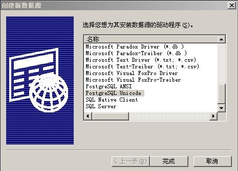 单击“添加”,选择PostgreSQLUnicode,再点“完成